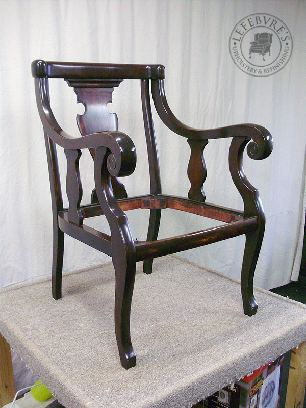 These are two exceptionally well made chairs by CFM (Canada Furniture Manufacturers) probably from around the 1920s or 30s. One of the chairs was in good shape, but with one bad repair, and the other had a very worn finish, so the owner chose to have both chairs stripped and redone. The original needlepoint covers were removed (and saved) and the client wanted to have them cleaned and reinstalled, but she was told by the dry cleaners that they couldn't clean them for her, so she picked another red fabric for the chairs.